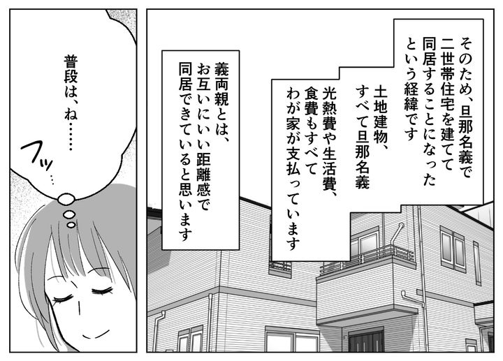 土地も建物も旦那名義で、生活費などもすべてわが家が支払っていますが、義両親とは、お互いいい距離感で同居できていると思います。孫もかわいがってくれるし、気も遣ってくれます。私の仕事が残業になったときは、快く孫のお迎えもしてくれます。しかし……。