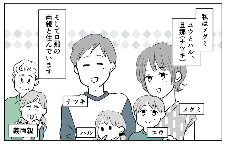 私はメグミ(32)。ユウ(小1)とハル(4)、旦那のナツキ(33)と4人家族です。事情があり二世帯の家を旦那の名義で建てて、その家に私たち家族と義母、義父で暮らしています。義母と義父はいつもほどよい距離感のいい人たち。ただ年齢的に2人ともあまり動けず、介護とまではいかないけれど、掃除や家事などにはあまり手が回りません。私は正社員で働いているので家事の全部を担うのはとても大変ですが、その分義母たちはユウたちのお世話をしてくれたりしています。