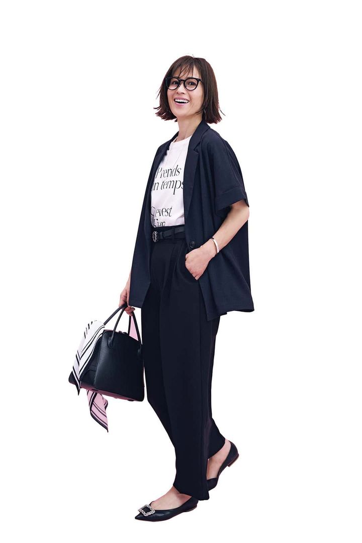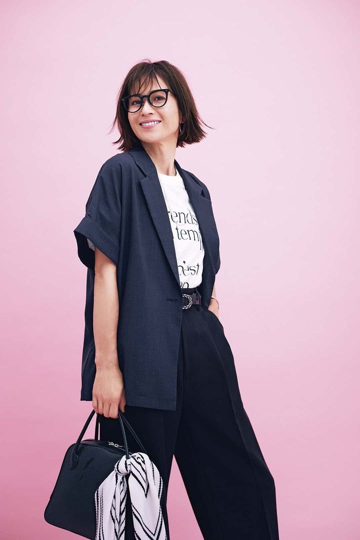 半袖ジャケット¥6,996(ロペピクニック/ジュンカスタマーセンター)ロゴTシャツ¥3,990(アンフィーロ)パンツ¥4,950(BASEMENT online)バッグ¥79,200(メゾン カナウ/ヤマニ)パンプス¥39,600(ピッピシック/ベイジュ)ベルト¥27,500(ニアー ニッポン/ニアー)スカーフ¥6,930(アンタイトル)メガネ¥39,600(プロポ/プロポデザイン)ピアス¥47,300パールネックレス¥46,200(ともにリューク)バングル¥7,560(アビステ