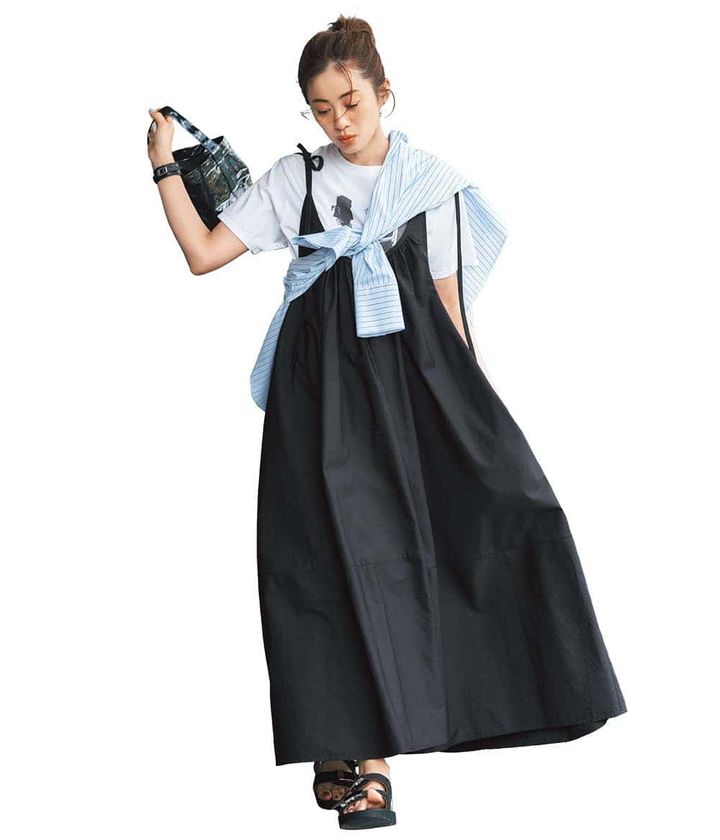 インナー次第で夕飲みにもリゾートにも似合いそうな黒のキャミワンピですが、子供とのお出かけには白Tを合わせてカジュアルにシフト。さらに羽織りものをプラスしてもゴチャつかないのは、白ベースのTシャツならでは。