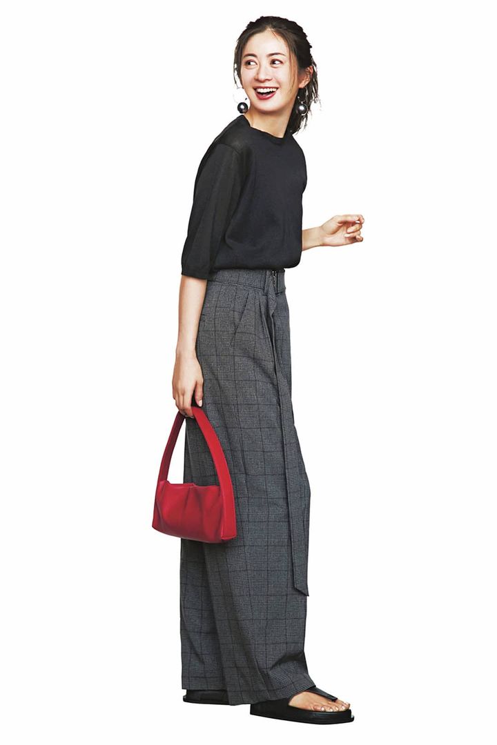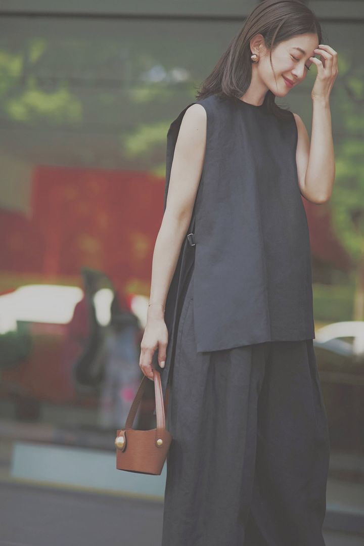 ノースリーブトップス¥35,200パンツ¥51,700(ともにサクラ/インターリブ)バッグ¥51,700(ニューイ/ショールーム ロイト)ピアス¥31,900(ミショー/ハウス オブ ロータス)ブレスレット¥159,500(プライマル)