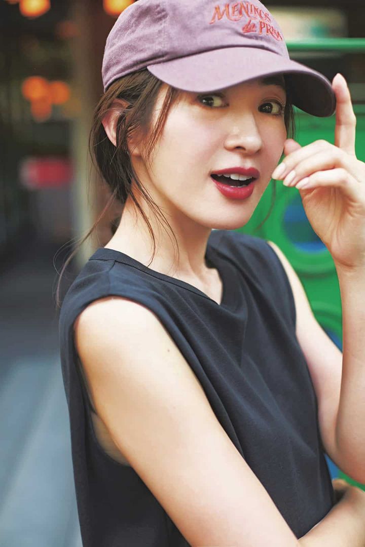 ノースリトップス¥3,990(アンフィーロ/オンワード樫山お客様相談室)スカート¥18,700(プランクプロジェクト/プランクプロジェクト 青山店)バッグ¥16,500(ハウスオブ ロータス)シューズ¥96,800(パラブーツ/パラブーツ青山店)キャップ¥8,250(ザ シンゾーン/シンゾーンルミネ有楽町店)ピアス¥113,300※片耳価格(プライマル)