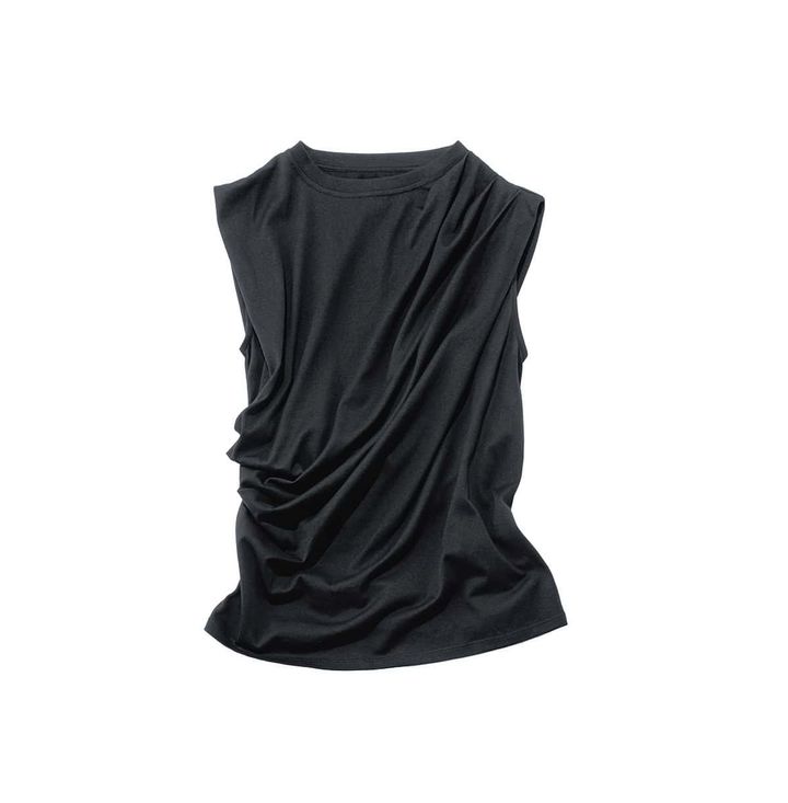 アシメトリーの変化球タンクは、コーデのアップデートに最適。トップス¥7,920(エミ/エミ ニュウマン新宿店)