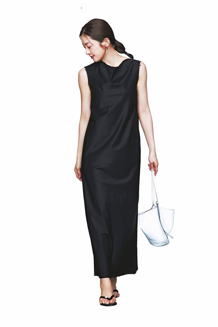 黒ワンピース¥71,500(チノ/モールド)キャミソール¥6,380(エミ/エミ ニュウマン新宿店)バッグ¥35,200(オルセット/プルミエ アロンディスモン NEWMan新宿)サンダル¥31,900(ピッピシック/ベイジュ)ピアス¥22,000(エナトー〈エッセンスオブアナイ〉/アナイ)