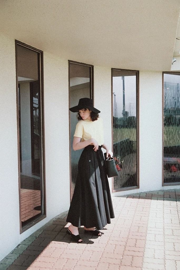ドレープの効いたボリュームスカートを上質なリラックス感に落とし込む幅広ハット。存在感のある上下で挟んだトップスは、ペールイエローのTシャツでラフに装い、ドレス感のほどよい日常に映えるルックスに。