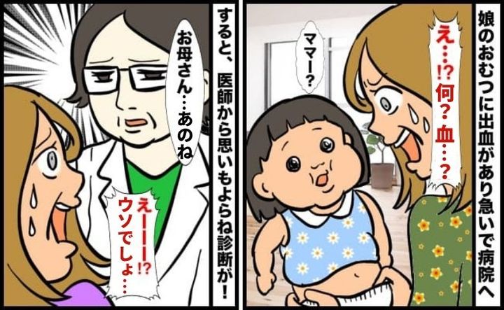 保育園へ行こうと朝の準備をし、2歳の娘のおむつを替えていると、何かが違うことに気がつきました。なんと、おむつに赤い血がついていたのです! 不安になって保育園を休み、すぐに病院へ行きました。生きた心地がしないまま診察してもらうと、医師の口から「お母さん、これね……」と。