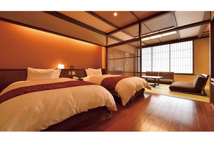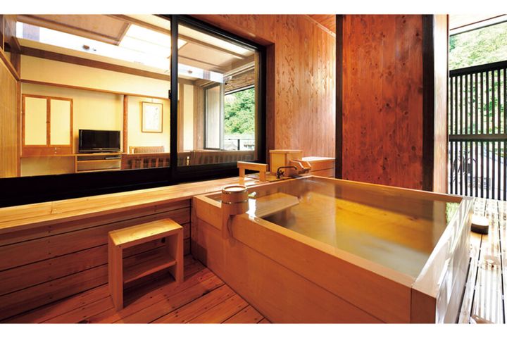 ユニバーサルデザインの客室は源泉が引かれた半露天があり、車いすも対応可能。3世代でも気兼ねなく温泉を楽しめます。