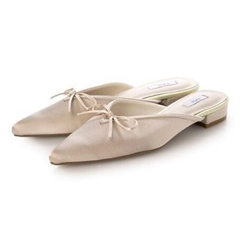 サテンポインテッドトゥミュール(2)/EVOL しっとりとしたサテン生地で、低めのヒールでもエレガントな佇まい。 アッパーのリボンがひかえめなアクセントに。