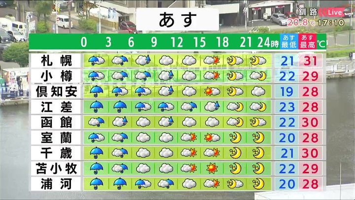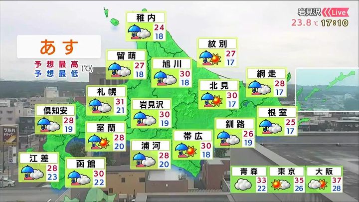 明け方まで激しい雨が降りますが、昼頃には広くやむでしょう。江差など渡島半島では夕方まで雨が残りそうです。日ざしが少なくても気温は30度前後と蒸し暑くなります。