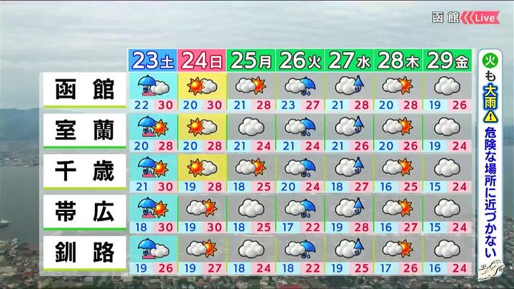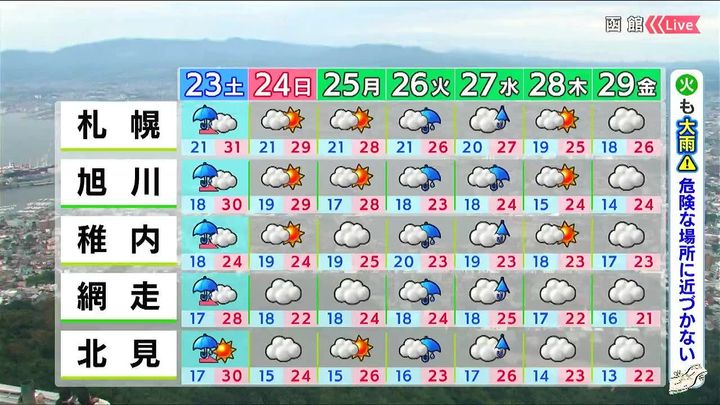 日曜は日本海側で日が差しますが、オホーツク海側は雲に覆われ、北風が涼しいでしょう。火曜日は各地で雨の量が多くなり、道北では火曜から水曜にかけて再び大雨になるおそれがあります。