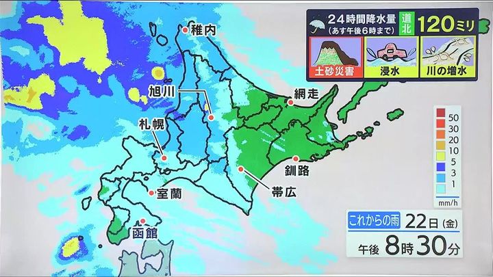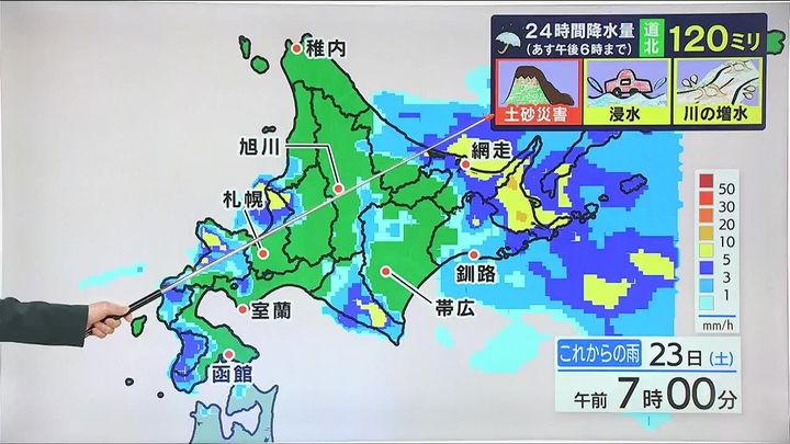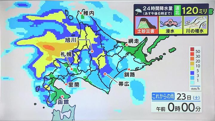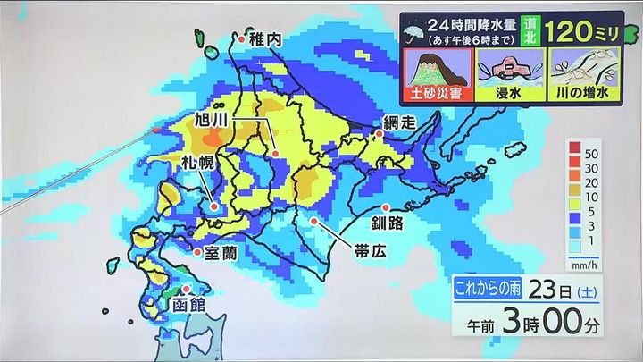 日付が変わる頃からは道北を中心に雨が強まり、道北の多いところで、あす23日(土)夕方までの24時間に120ミリの大雨になります。