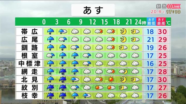 午前中は雨でオホーツク海側を中心に明け方まで激しく降ります。午後は日の差す時間があるでしょう。帯広や北見は30度の予想で、熱中症にも注が必要です。
