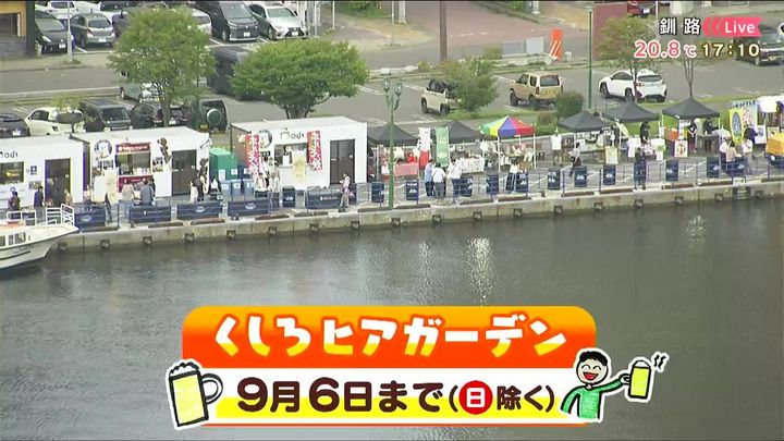 釧路の幣舞橋のすぐ近く、「ぬさまい広場」で「くしろヒアガーデン」が開催中です。涼しい釧路なので、「ビア」ではなく「ヒア」なんですね。