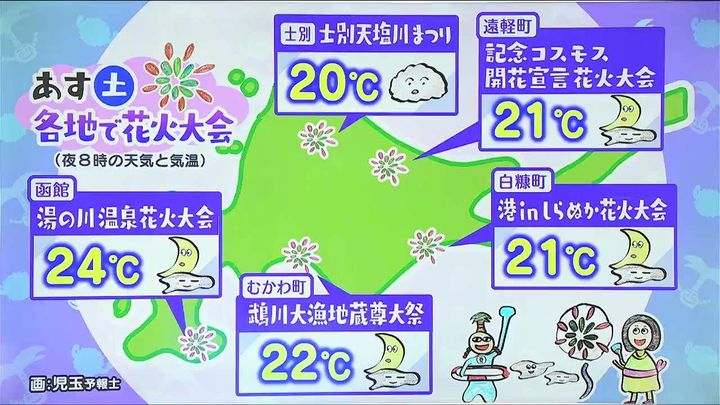 夜は雨はやんで、函館や士別、むかわ町、白糠町など天気の崩れはなさそうです。遠軽町はコスモス開花宣言花火大会ですが、暑さのせいか、まだ開花までもう少しかかりそうです。ただ、夜空には大輪の花火が打ちあがりそうです。