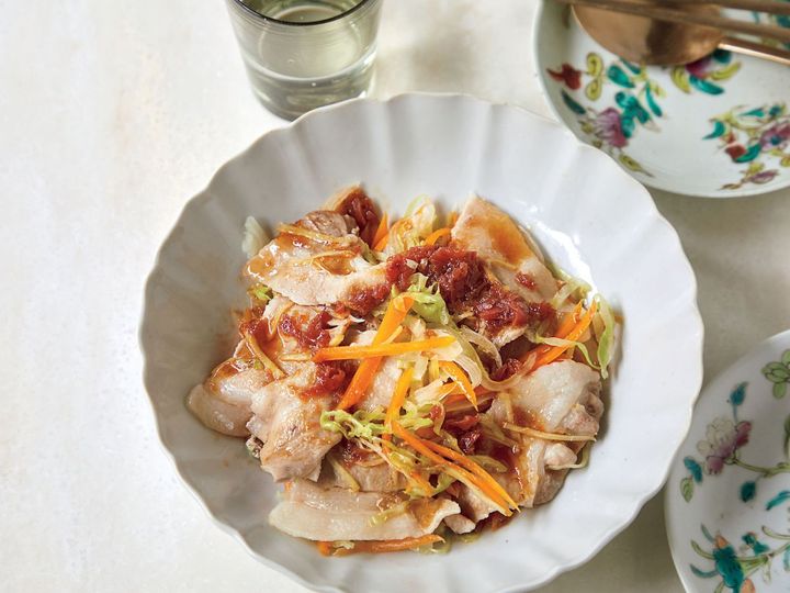 貧血や肌の乾燥、目の疲れにいいにんじん、血の巡りを良くし、シミに効く玉ねぎ、胃の働きを良くし、便秘やむくみの改善にも役立つキャベツの3色野菜と豚肉をフライパン蒸しに。