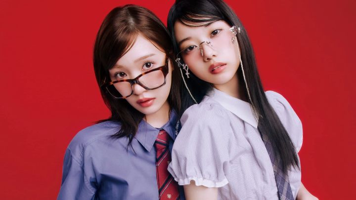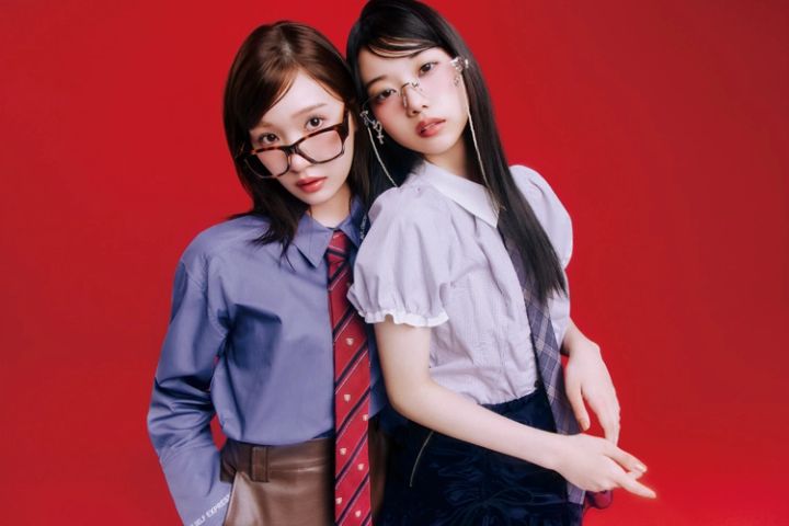 〈右・北里琉〉リムレスメガネ 1,760円、ネイビーネクタイ 1,100円/ともにSPINNS メガネチェーン 13,200円/YELLOWSWALLOW(SHOWROOM CHRMR)チェック柄シャツ 5,390円/OLIVE des OLIVE ネイビーショートパンツ 16,280円/pain(lilLilly TOKYO)〈左・中川紅葉〉べっ甲柄メガネ 41,800円/SPRIGSTRINGS(SHOWROOM CHRMR)赤ネクタイ 1,100円/SPINNS ブルーシャツ 14,300円 ブラウンレザースカート 14,080円/ともにNarcissus