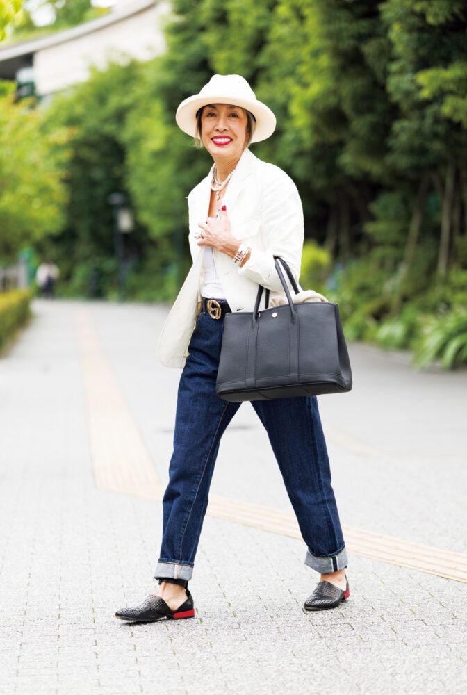 【60代お手本スナップ】「ラルフローレン」の白ジャケット×「オキーフ」のデニムパンツで作る洗練された大人カジュアル!