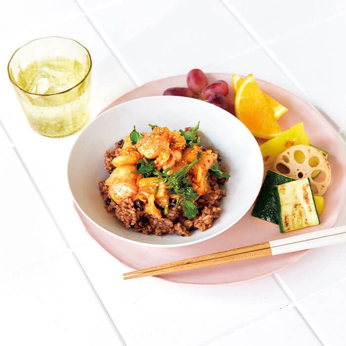 週末はワンプレートで手軽に腸活♪ お刺し身のキムチマリネをのせた丼に善玉菌のエサとなるグリル野菜やフルーツを追加。