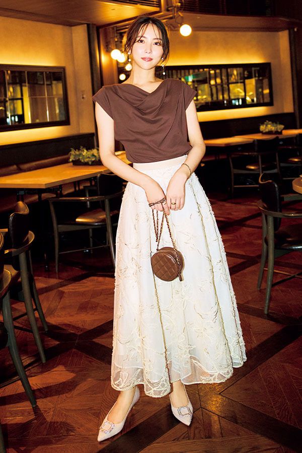 ドレープトップス×刺しゅうスカートで女っぽさを加速