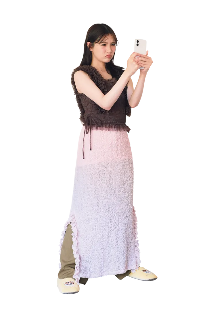 フリル×フリルのガーリーさん向けスタイル。スカートはタイトなシルエットを選ぶことで、甘くなりすぎずバランスが取れたコーデに仕上がる。