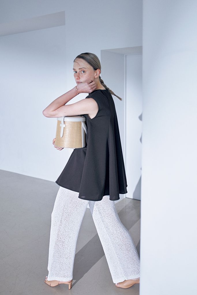 ニットのようなざっくりとした編み目により、ルーズなパンツの間のびを回避。黒並みに緊張感のある真っ白な色みで、ラクしてスマートな仕上がりに。天然繊維ラフィアとリネン・コットンをMIXした軽量感が魅力。直線的なフォルムにより、長め丈のトップスとでももたつく心配は不要。 白リネン混パンツ/MADISONBLUE(マディソンブルー) ノースリーブプルオーバー/l’heritage martinique(マルティニーク ルミネ横浜)