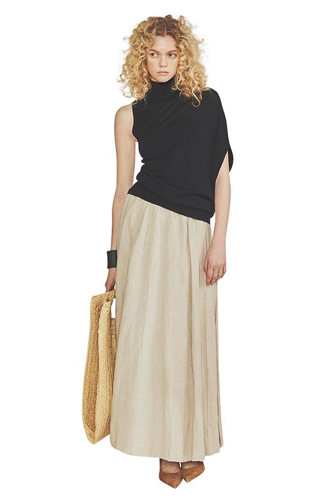 「細くも広がりすぎもしない」落ち感のあるリネン素材。デザイン性のあるトップスに、スカートの質感で無地の上下をブラッシュアップ。まっすぐに見えて、適度な余白もある。そんな理想的なシルエットも、落ち感のあるリネン素材によるもの。すっきり見える形ながら、たっぷりとしたドレープの陰影によって、上下シンプルな装いにメリハリもつく。 ベージュリネンスカート/フラデリ 黒アシンメトリーハイネックトップス/カルバン・クライン