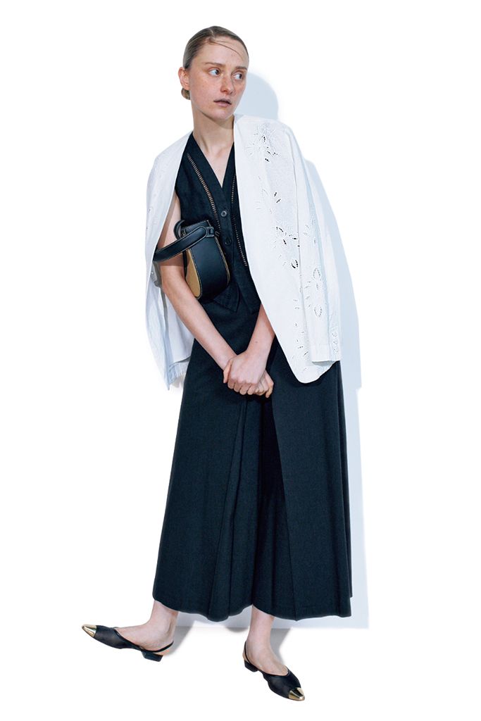 フラワーモチーフのカットワークジャケットを、アクセ感覚でON。白のリネンですっきりととり込むと、フレアパンツで少し甘口に寄せてもフェミニンになりすぎない。 白リネンジャケット/イエナ 中に着た黒リネンベスト/バナナ・リパブリック 黒リネンパンツ/プルミエ アロンディスモン