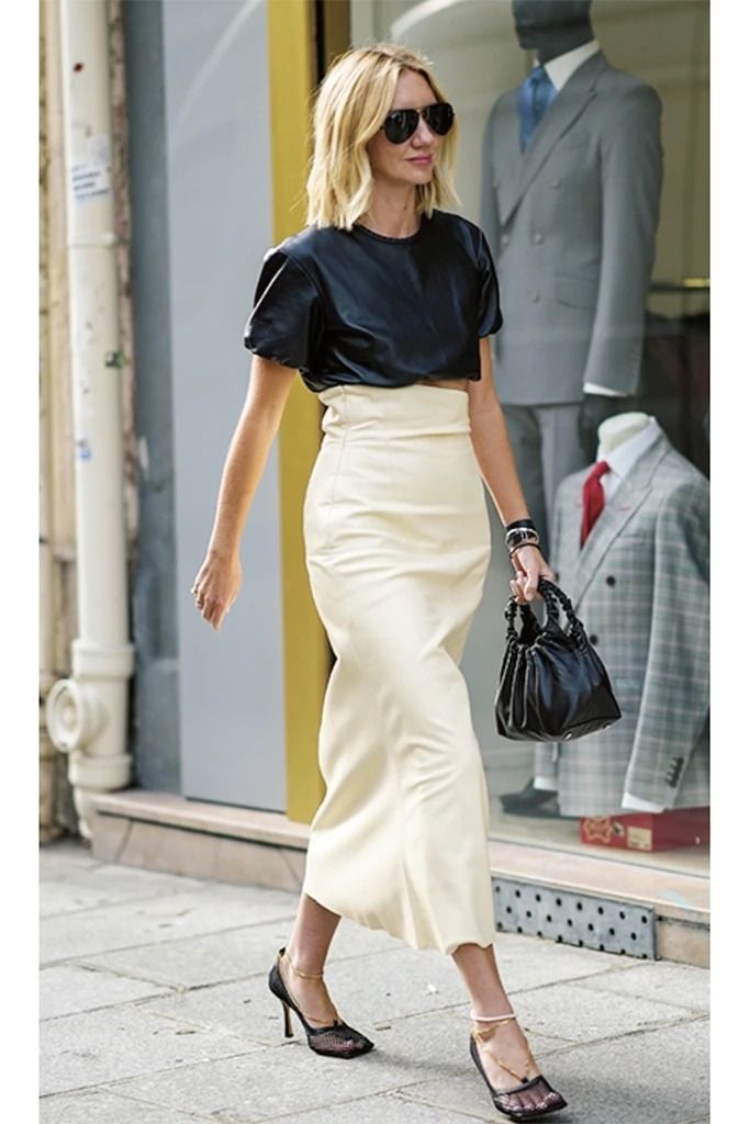 今季豊富な、ショート丈トップスを生かすべく、スカートは思いきりハイウエストなもので、ツートーンのワンピース風に仕上げるのも一手。腰位置を上げれば、Iラインシルエットをさらにスタイルよく。丈と合わせて配色もメリハリが効いているから、背が低い人でも脚が短く見えない。