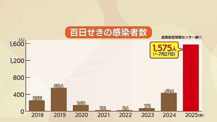 北海道の百日せきの感染者数は、6月以降、8週連続で100人を超えていて、2025年は7月27日までに、1575人に上っています。