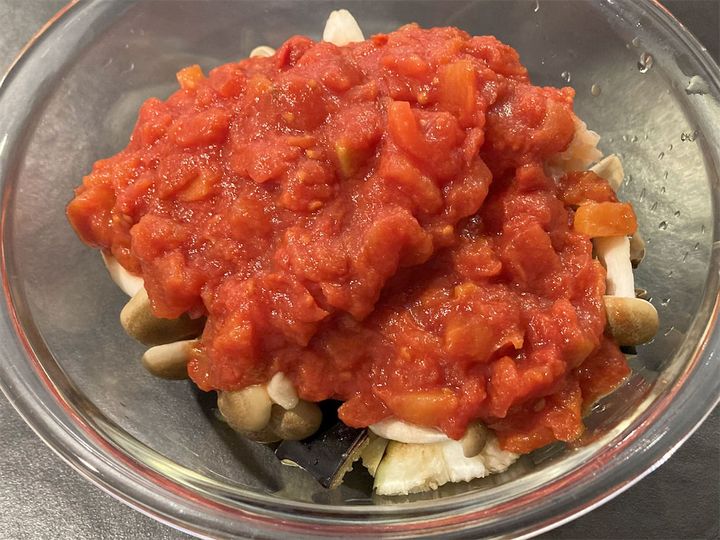 3. 鶏ひき肉とトマト缶もボウルに入れます。加熱前の具材準備はこれで完了。まな板や包丁を使わないのがありがたい!