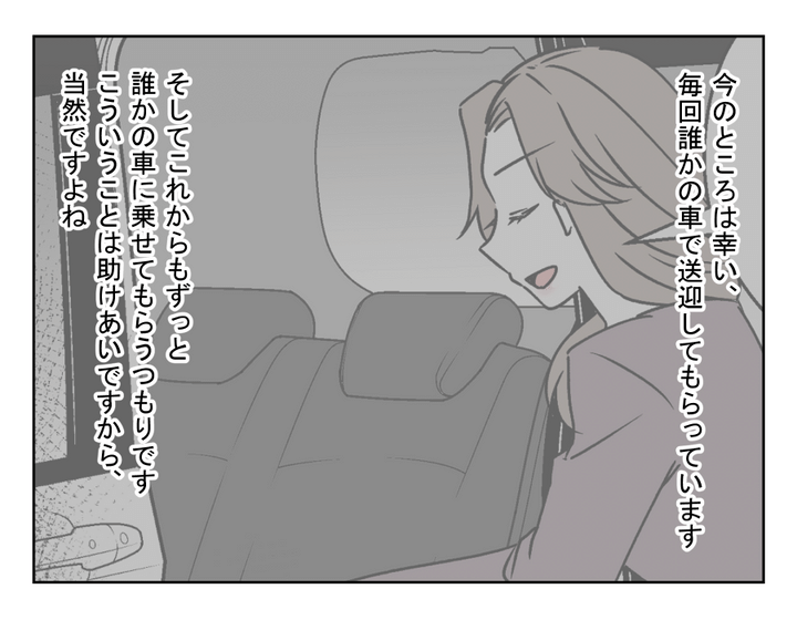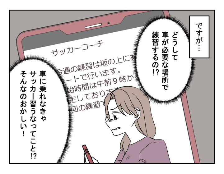 レイナくんがサッカーで輝くことがスズネさんの喜びであり、希望であり、そして心の支え。スズネさんは、保護者としてサッカーを支える活動に、どんどんのめり込んでいきました。それゆえに、交通アクセスが悪い場所での練習が多くて、何とも歯がゆかったそうです。「こういうことは持ちつ持たれつだよね」と、他のパパやママの車で送迎してもらっていたスズネさん。ですが一方的に乗せてもらう立場は……はたして「持ちつ持たれつ」なのでしょうか?