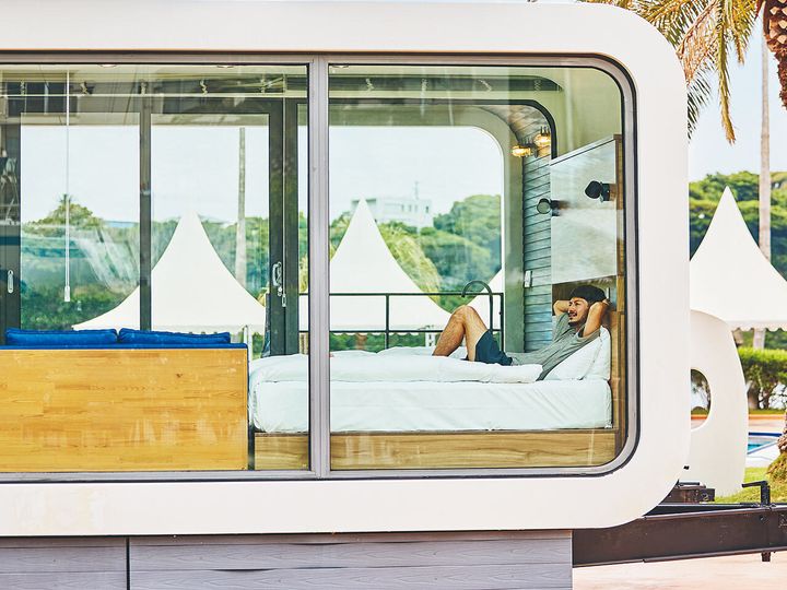 宿泊も可能なこの客室は、コンパクトながらも窓を一面に施した開放感のあるデザインで、大自然の景色に囲まれながら寛げる。