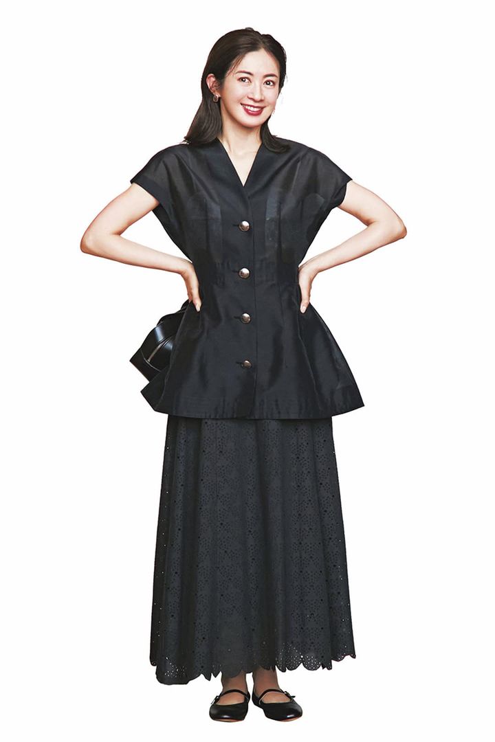 黒ワンピース¥71,500(チノ/モールド)キャミソール¥6,380(エミ/エミ ニュウマン新宿店)バッグ¥35,200(オルセット/プルミエ アロンディスモン NEWMan新宿)サンダル¥31,900(ピッピシック/ベイジュ)ピアス¥22,000(エナトー〈エッセンスオブアナイ〉/アナイ)