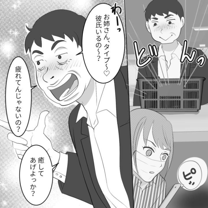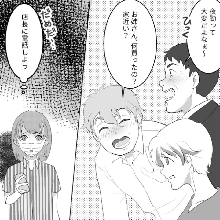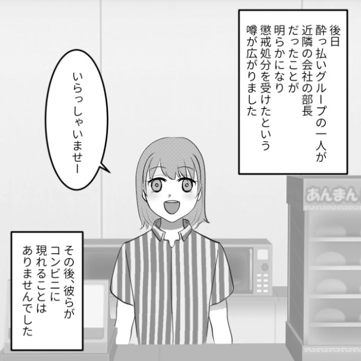 駅前のコンビニで働く主人公。その日は夜勤をしていました。そこにやってきた酔っぱらった中年サラリーマン集団。
