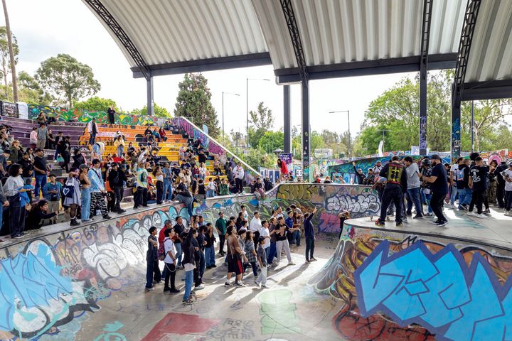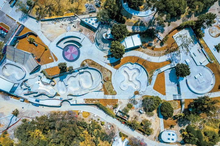 アメリカ大陸最大級の都市森林公園・チャプルテペックの一角で、2007年に閉業したウォーターパークの廃墟は、違法行為が横行する危険な場所であった。だが一方で、地元の若者たちがグラフィティを描いたり、スケートを楽しんだりする表現の場にもなっていた。そのポテンシャルを生かし、23年にメキシコ政府がストリートカルチャーのための公共公園へと改修したのが〈パルクル〉だ。
