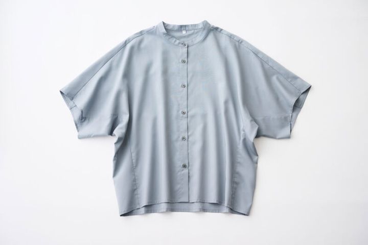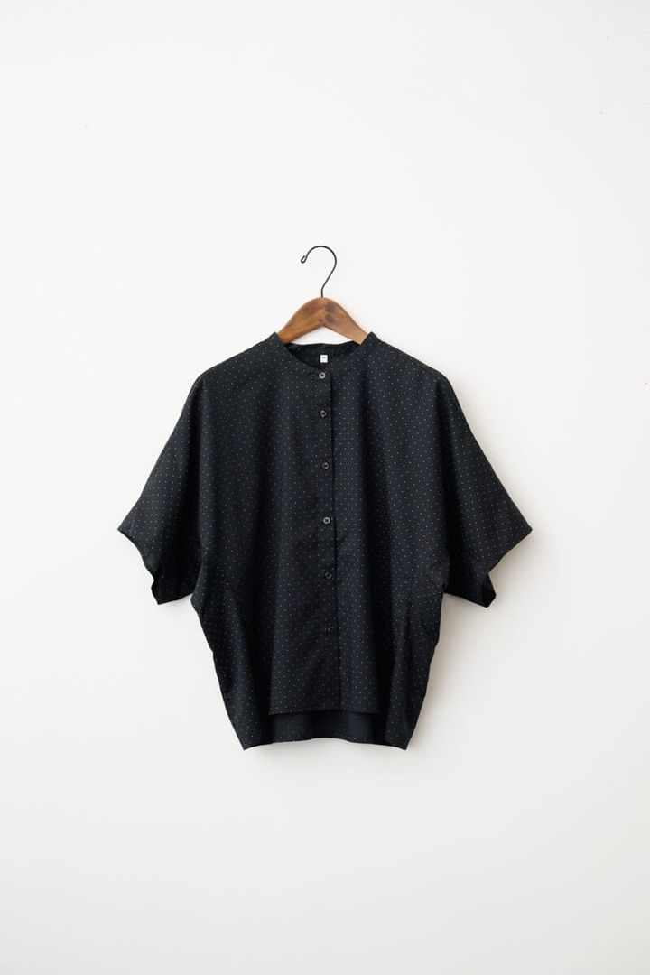 ゆったりとしたドルマンスリーブのバンドカラーシャツ。カラーは、黒ドット柄のほか、黒、スモーキーブルー、オフホワイトの全4色。サイズは、XS~XXLの6サイズ展開。