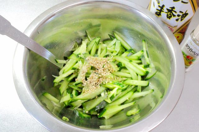 2. きゅうりを細切りにして、塩と酢を和えます。少しおいて水分を取り除き、ゴマ油、白ゴマ、お好みでこしょうを加えて和えます。