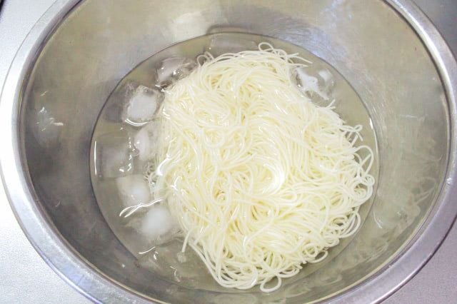 3. 沸騰したお湯(分量外)で、そうめんを商品の記載時間通りに茹でます。流水(分量外)で洗って、ぬめりを取ります。