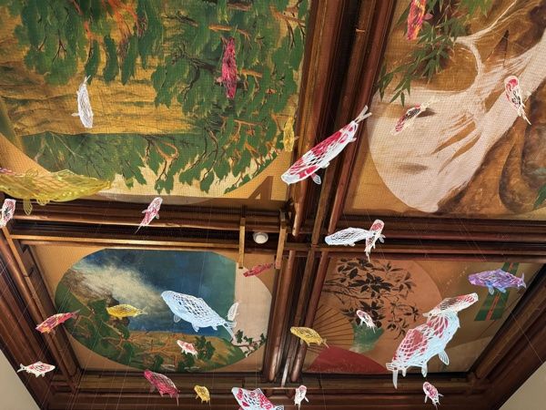 本展では、各部屋の装飾や天井画も見どころのひとつです。 頂上の間では、鬼がいなくなった現世の平穏な景色の象徴として、ゆったりと文化財を泳ぐ色鮮やかな錦鯉の群れを「紙にしきごい」で表現されています。微細な切り絵加工でデザインされたパーツを組み合わせた美しい作品が文化財空間を優雅に泳ぎます。