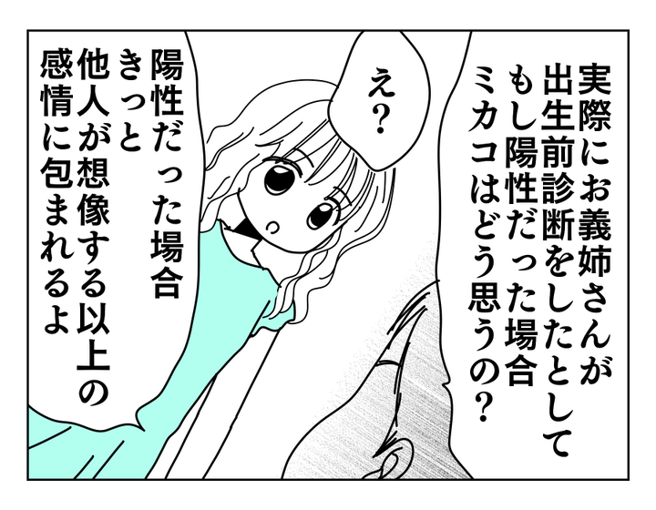 私(ミカコ)は、夫のコウヘイと、現在8歳のカナと5歳のリオの姉妹を育てています。私の5歳年上の姉は、昔から優しくてあまり怒らない人でした。そんな大切な姉が結婚をして、しかもとんとん拍子に妊娠まで! もう高齢だから子どもは難しいかな~なんて思っていたので、自分のことのように嬉しかったです。それなのに、いきなり姉から「今後は連絡を控えさせてください」とメッセージが……。母が姉に連絡すると、姉は私が出生前診断をすすめたことが原因みたいな言い方をしてきたのです。母も別に私は悪くないって言います。なので母と姉の家におさがりを届けに行ったら、姉から絶縁宣言をされてしまいました。夫からも「ミカコが無神経だったと思う」と言われ……?