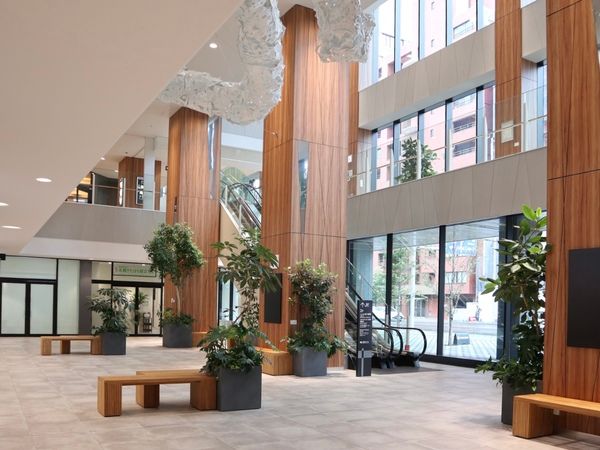 エレベーターを降り、待っていたのは空に伸びる高い吹き抜けの空間!ナチュラルな木々や植物が彩るガラス張りの開放的な造りで、駅そばにいることを忘れてしまいます。