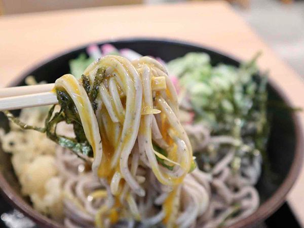 サクッとした揚げ玉やキリッとした青ネギ、柔らかなかまぼこ、磯の香りが広がる海苔といった味の変化が楽しめるトッピングは蕎麦との相性◎