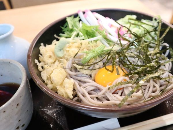 胡麻色の蕎麦がたっぷり!卵黄、刻み海苔、青ねぎ、かまぼこ、揚げ玉がおしみなくトッピングされています。おいしそうなビジュアルにうきうきします。