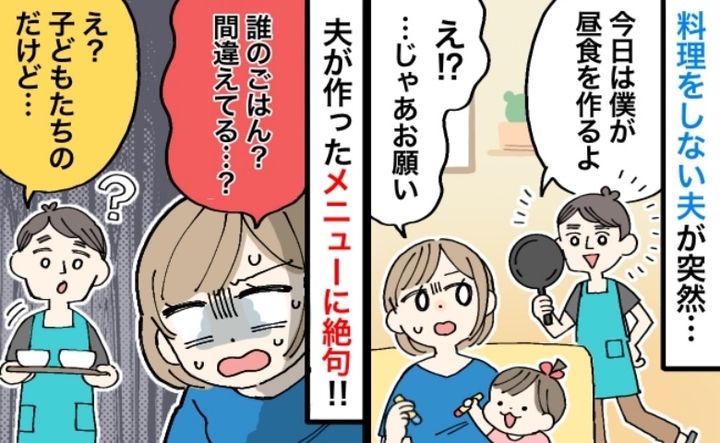 夫は教員で、土日も部活動に忙しく、私はこの5年間ほぼワンオペ育児でした。そんな中、久しぶりの休みに、夫が5歳の息子と2歳の娘のために張り切って昼食を作ってくれることに。ところが、夫は幼児食についてまったく知識がなく――。そんな夫が用意した、まさかの昼食メニューとは!?
