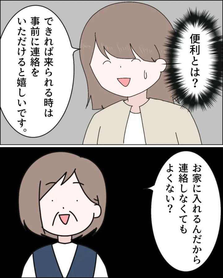 「便利とは?」と頭の中で考えながら、「できれば来られる時は事前に連絡をいただけると嬉しいです」と言うと、「お家に入れるんだから、連絡しなくてもよくない?」と平然と言う義母に、