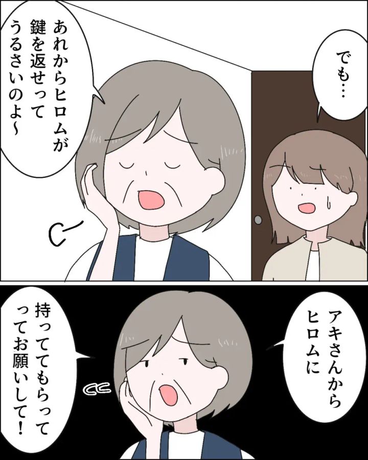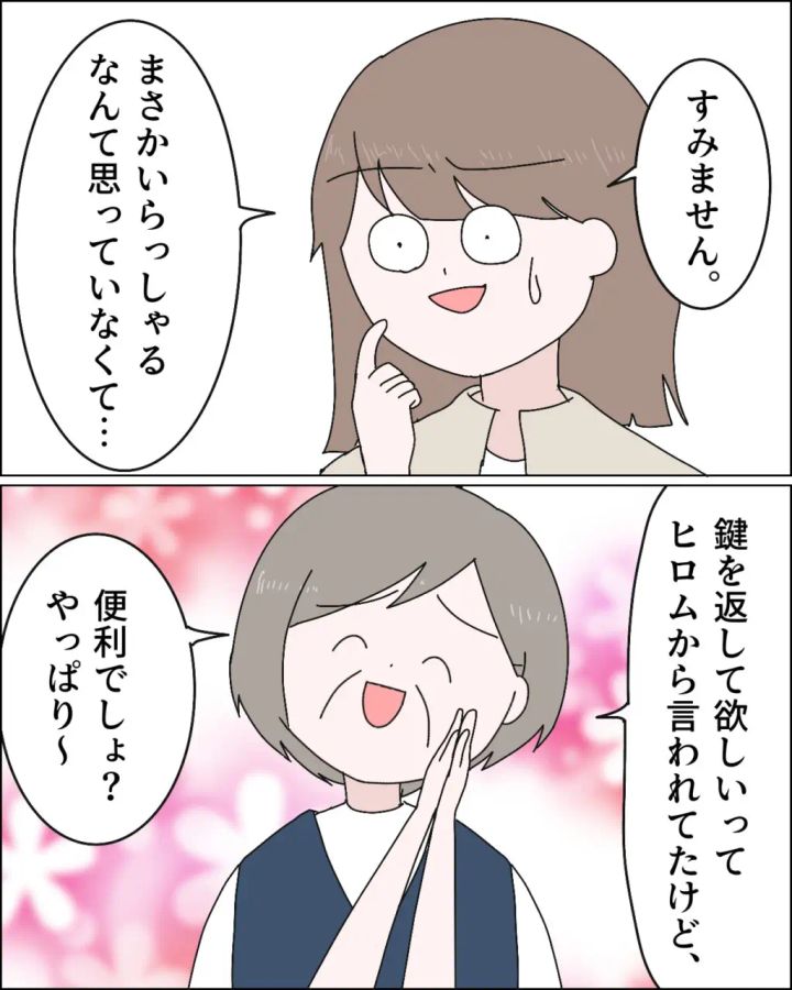 ある日、家に帰るとまた義母が!!ヒロムさんに鍵を返すよう言われたものの、やっぱり便利と言い出す義母に「便利とは?」と考え込むアキさん。すると、「アキさんからヒロムに鍵を持っててもらってってお願いして!」と言い出し、「私とあなたの仲でしょ?」と言う事を聞くよう圧をかける義母、どうしてアキさんの話も聞かず、自分がしたいことだけ叶えようとするのでしょうか?