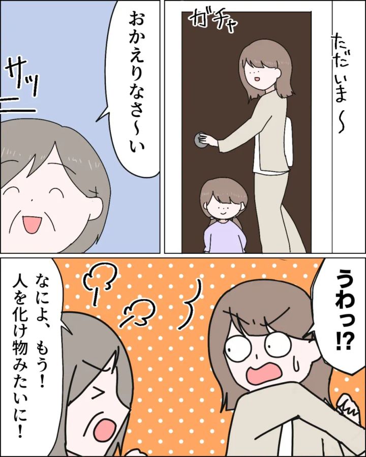 そしてまたある日。「ただいま~」と家に帰ると、「おかえりなさ~い」と義母が!「うわっ!?」意味がわからず驚く私に、「なによ、もう!人を化け物みたいに!」と怒る義母。