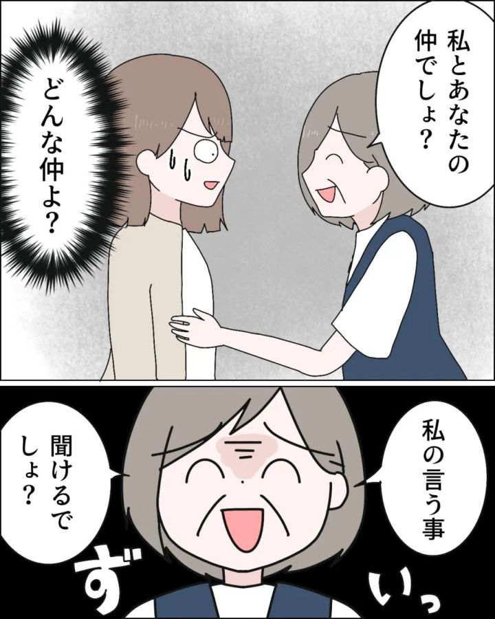 「私とあなたの仲でしょ?」と詰め寄られ、「どんな仲よ?」と思っていると、「私の言う事、聞けるでしょ?」と思いっきり圧をかけてきました。