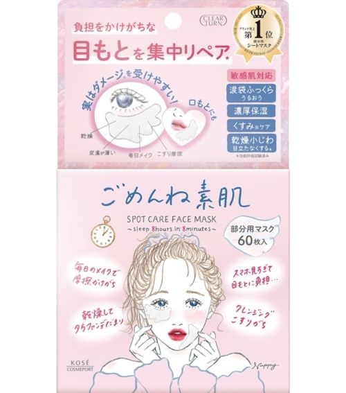 (2)クリアターン ごめんね素肌 スポットケアマスク 60枚入 負担をかけがちな目もとを集中リペア(※9)。うるおいをたっぷり与え、ふっくらハリのある目もとにみちびく部分用シートマスク。敏感肌自覚者による連用テスト済み(※14) で、デリケートな目もとにもやさしい使い心地です。人気イラストレーターNAPPYさんコラボデザイン。
