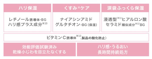 (2)デリケートな目もとにもやさしい使い心地 弱酸性・無香料・無着色・アルコールフリー・無鉱物油・紫外線吸収剤フリー・シリコーンフリーの低刺激処方に加え、パッチテスト・アレルギーテスト・スティンギングテスト・敏感肌自覚者による連用テスト(※14)各種試験済みのやさしい使い心地です。